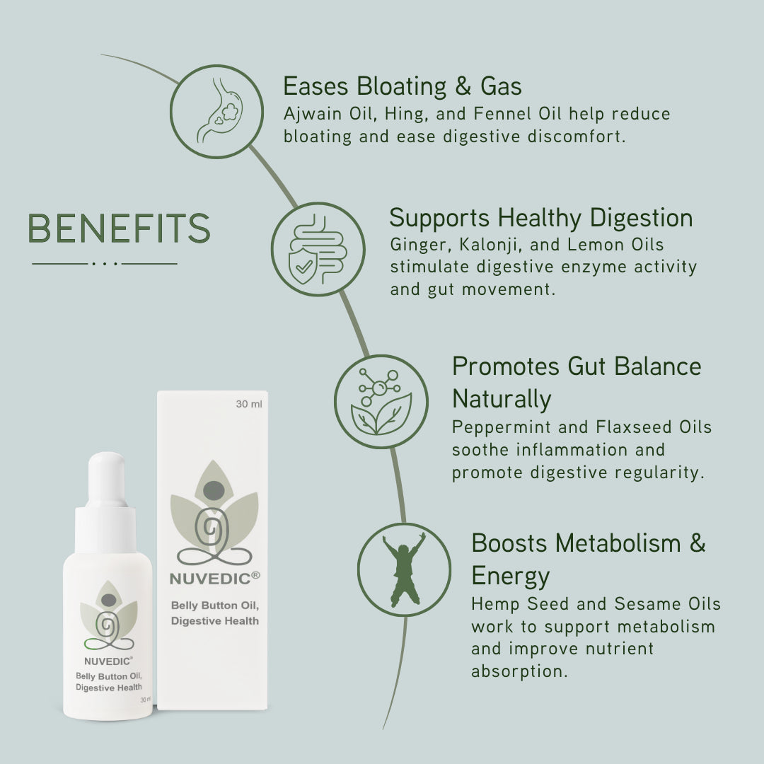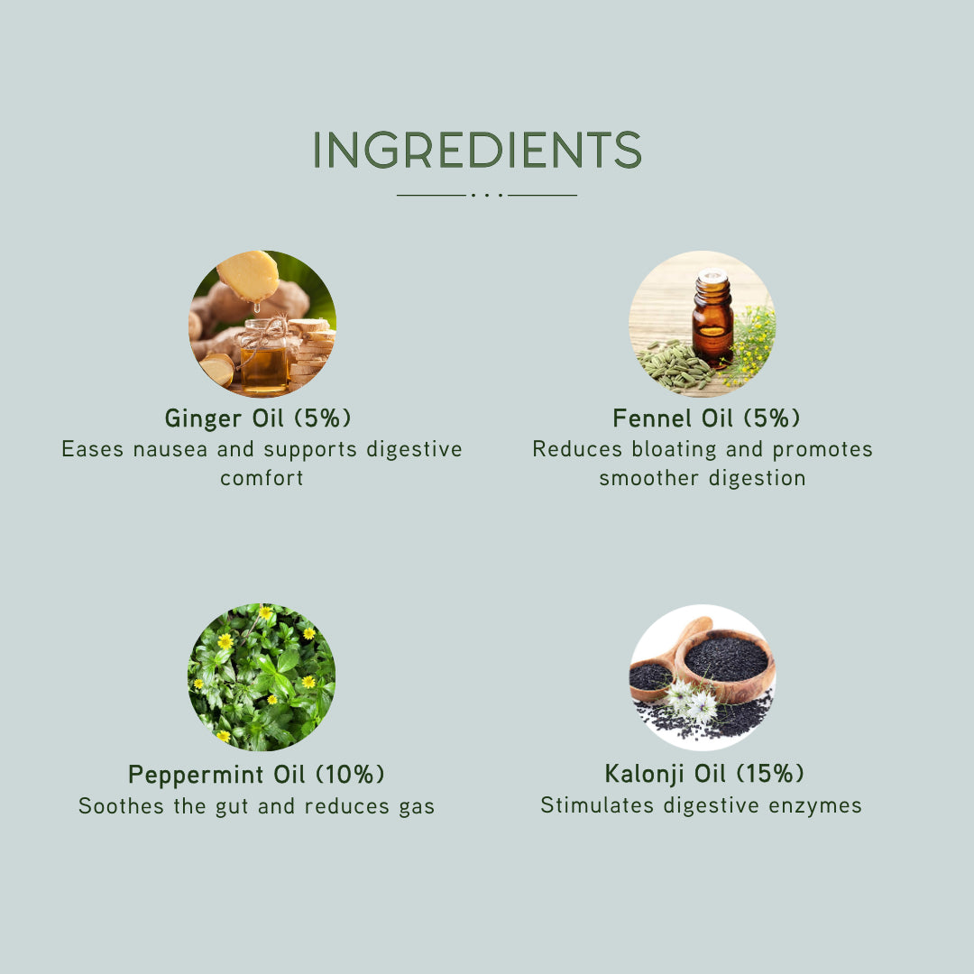 Ajwain Oil, Hing, and Fennel Oil help reduce bloating and ease digestive discomfort.