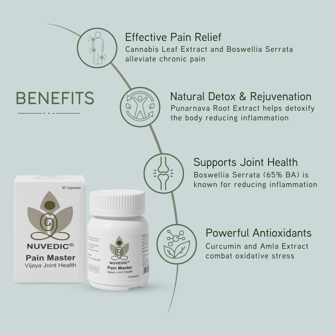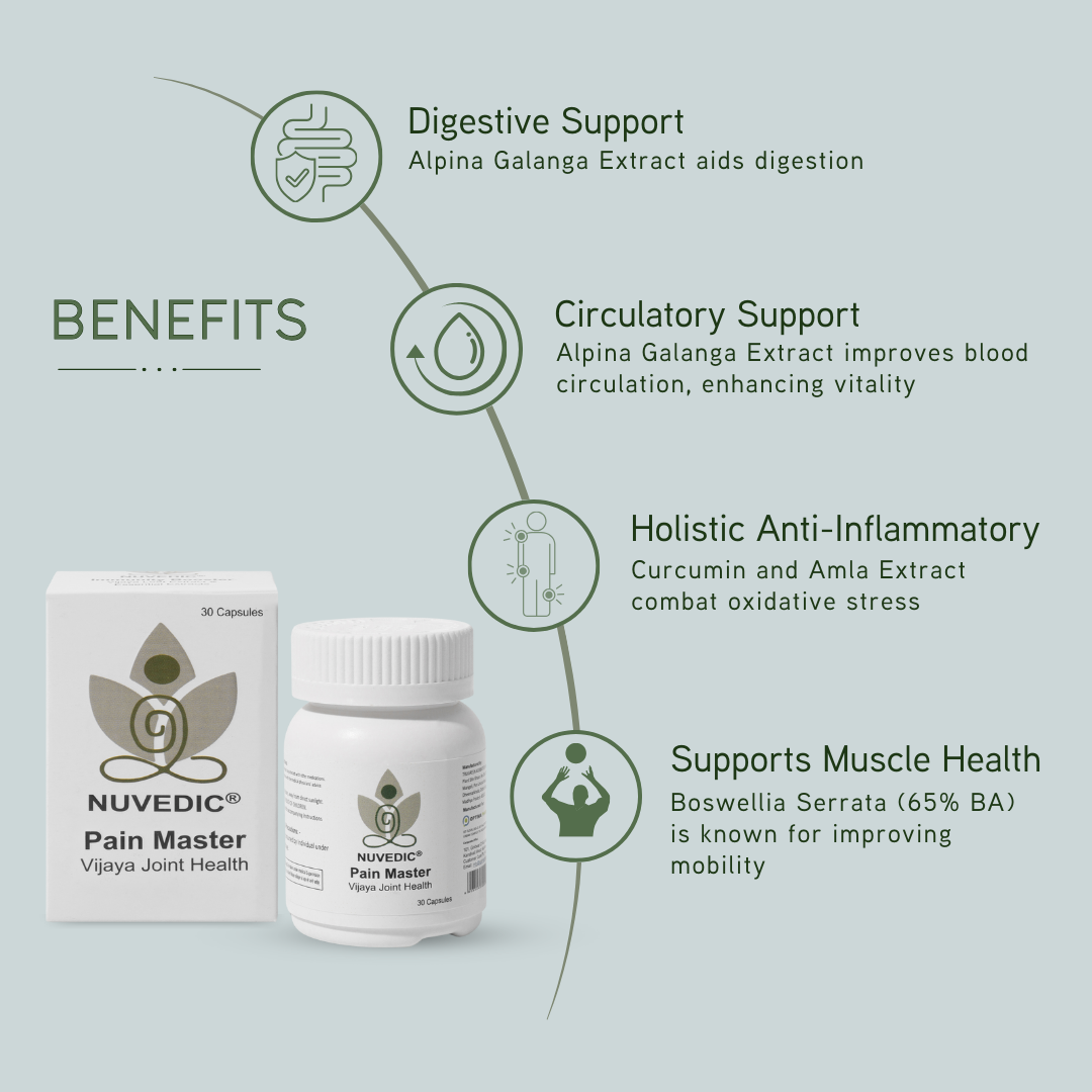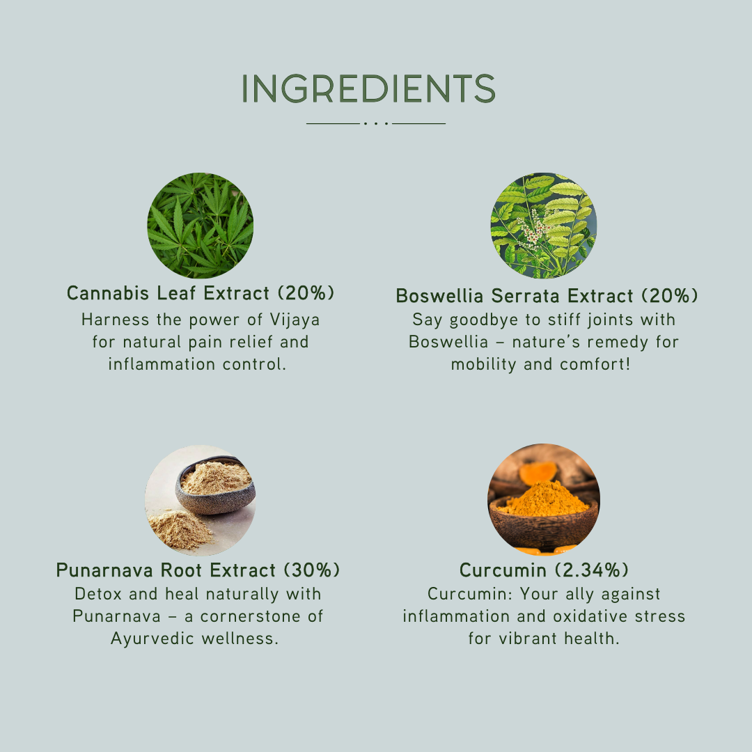 Combines the anti-inflammatory properties of Vijaya Leaf Extract and Boswellia Serrata to alleviate chronic pain, muscle discomfort, and joint stiffness.